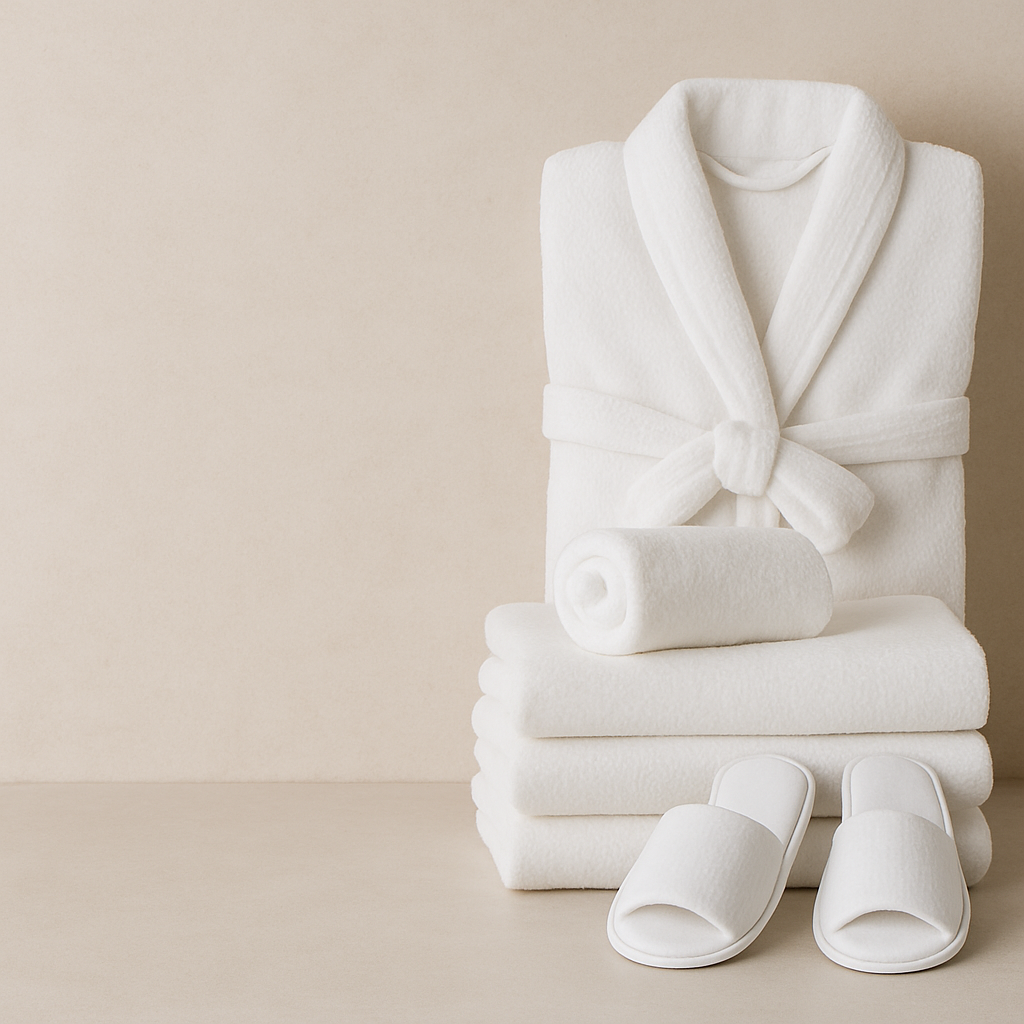 Yumuşak dokulu havlular, rahat bornozlar ve şık terliklerle otelinizin kalitesini bir üst seviyeye taşıyın. Misafir memnuniyetine katkı sağlayan dayanıklı ve estetik ürünlerimizle tanışın.